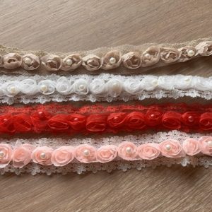 Fantasielint met bloemen en parels in wit/rood/roos/beige